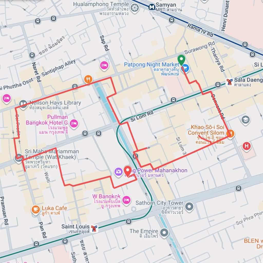 Highlights: Patpong morning market, Convent Road, Soi Phiphat, Naradhiwas Road, Silom Soi 7 morning market, Soi Pradit morning market, Mahanakhon tower